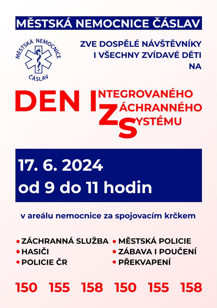 V pondělí 17. června v dopoledních hodinách se v areálu Městské nemocnice Čáslav uskuteční Den IZS, v rámci kterého se mohou děti i dospělí návštěvníci seznámit s technikou i prací jednotlivých složek Integrovaného záchranného systému.